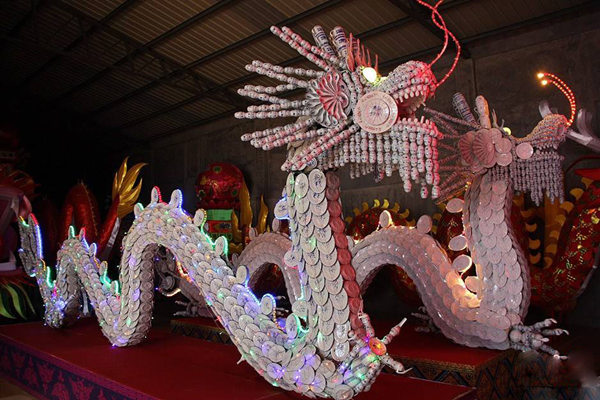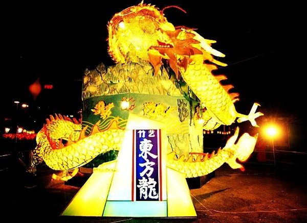 采用民间竹编工艺与现代科技结合,以大型雕塑造型构成假山、龙珠、龙壁和东方龙,勾勒出了一幅巨龙腾飞、群龙欢腾的美好画卷。